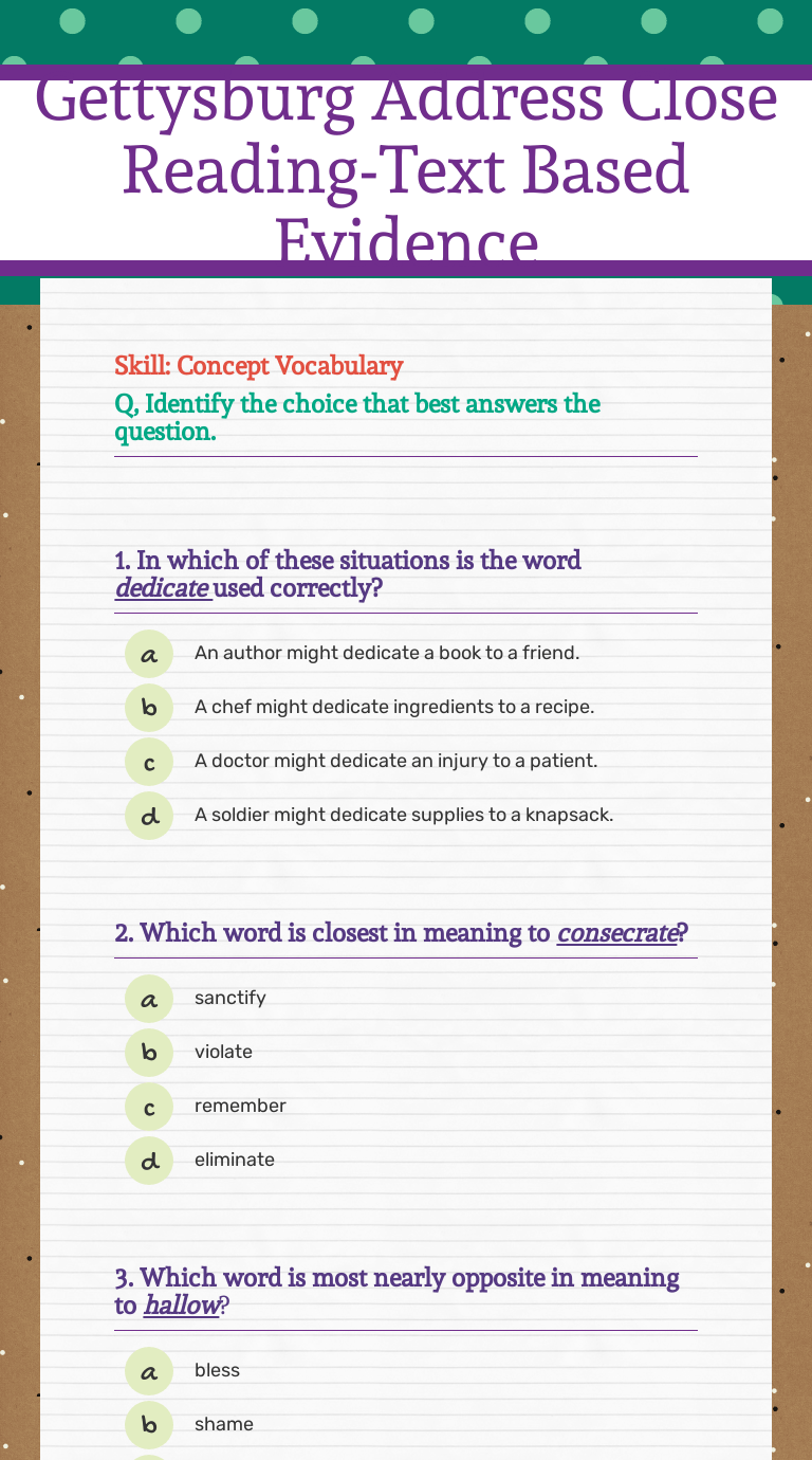 Address and its historical significance, and memorizing the . Reading, grade 4 supports national standards and helps your students master reading comprehension skills across a variety of genres. Included is a detailed lesson plan, . Four score and seven years ago our fathers brought forth on this . Open the class by explaining to students that they will be examining the gettysburg. You will want to print these reading comprehension worksheets. Abraham lincoln delivered this famous speech at the dedication of the. Discuss as a class why these words are significant. Return to the focus question, 'what was abraham lincoln's main point in the gettysburg address?' Gettysburg address teacher resource online classroom materials include a video . Sponsored by sponsored by the gilder lehrman institute of american history. Informational (nonfiction), 2,125 words, level x (grade 5), lexile 1020l. Abraham lincoln's stirring speech, "the gettysburg address" is one of the most famous of all american speeches.